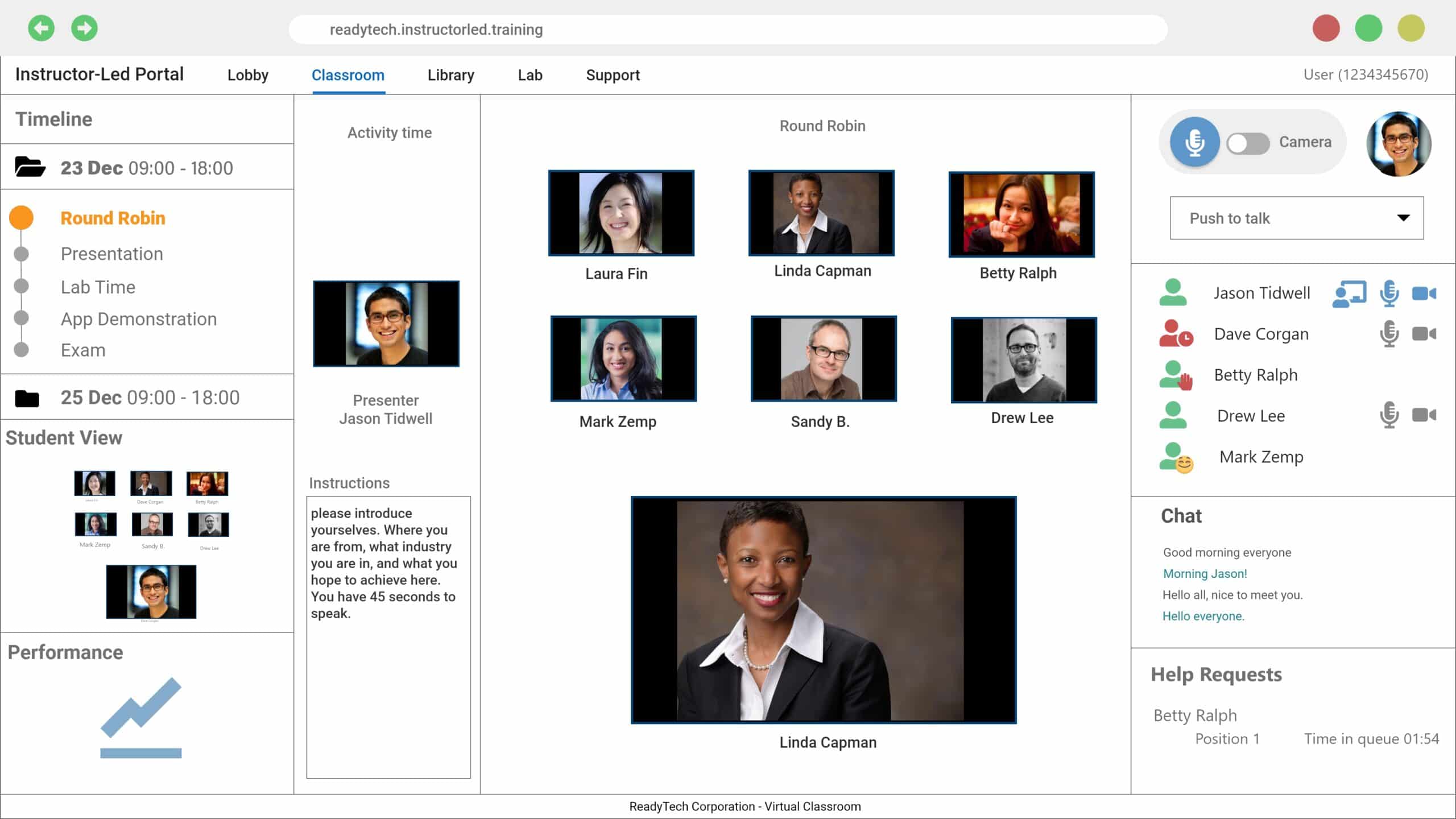 Our virtual classroom is a state-of-the-art solution for virtual instructor-led training, designed to enhance the learning experience for both instructors and students. It features robust public and private chat options, versatile audio modes including a request microphone feature, and seamless video integration with round-robin introductions. The presentation timeline ensures your classes stay on track. Additionally, the integrated help request system efficiently organizes student inquiries, ensuring timely support. With these advanced features, our virtual classroom provides an unparalleled interactive and structured learning environment, making it the best choice for your virtual training needs.